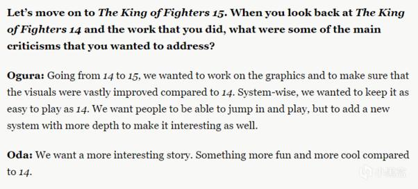游戏媒体Polygon本周发布了一篇对SNK开发者的采访报道,SNK总制作人小田泰之和艺术总监小仓荣一就各种问题进行了回答,其中包括了对《拳皇15》的相关内容。