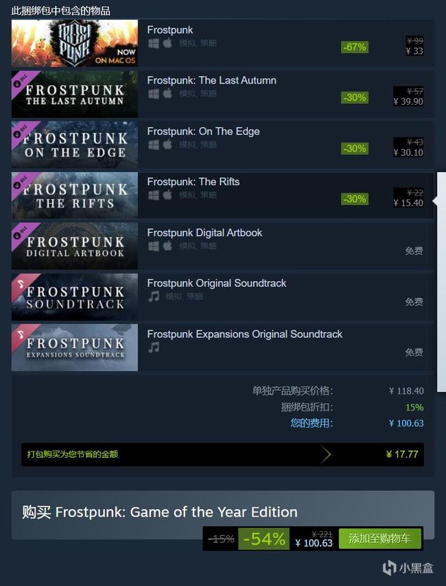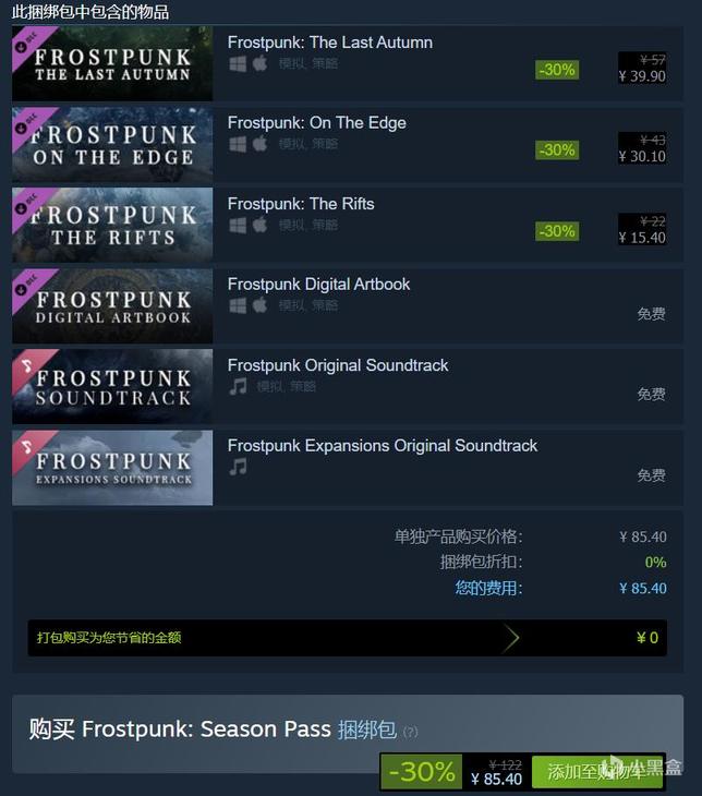 完整版《冰汽时代》季票现已推出!拥有季票后,玩家将能够体验自游戏正式推出后的所有额外内容,其中包含三份扩展包The Last Autumn(《最后的秋天》),On The Edge(《帝国的边界》)以及The Rifts(《大地裂缝》),三份扩展包中的内容对本体故事进行了大幅度的扩展并且填补了游戏世界观中大量未曾讲述的剧情。