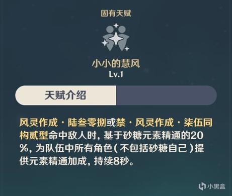 一个20级的精通沙漏就能给我们带来187的元素精通,但一般情况下,主C是不会选择用主属性去堆精通的,所以砂糖作为精通怪的作用就体现出来了。砂糖的两个突破天赋都能给队友加元素精通,下面简要说明一下吧。