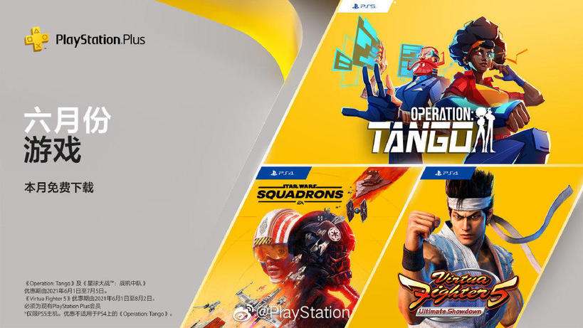 PlayStation Plus 港服六月份会员免费游戏现已公布,本次三款免费游戏与欧美服相同,分别为PS5《代号:探戈》,PS4《VR战士5:最终决战》,PS4《星球大战:战机中队》。玩家可以在6月1日至7月5日免费领取,其中《VR战士5:最终决战》领取时间截止到8月2日。