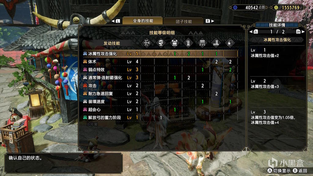 还是老样子,技能方面体术/耐回,强弓,通常弹强化3必出。余下二级孔出弱特、攻击、超会心,一级孔插属性强化和装填速度。下面的配装绑定体术4耐回2装填速度2,不需要的同学可以按照下面的技能顺序替换。