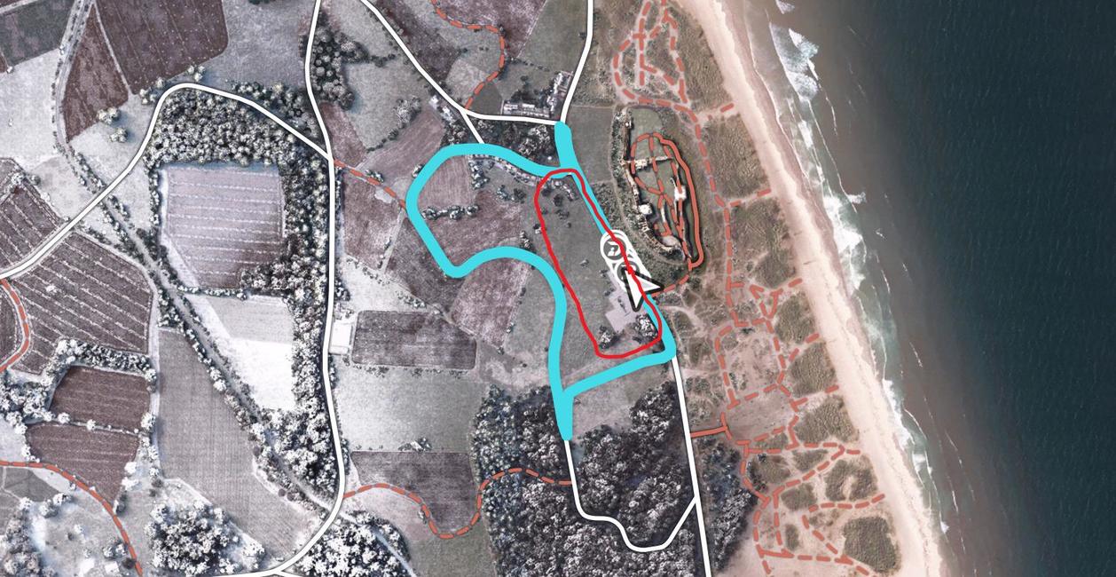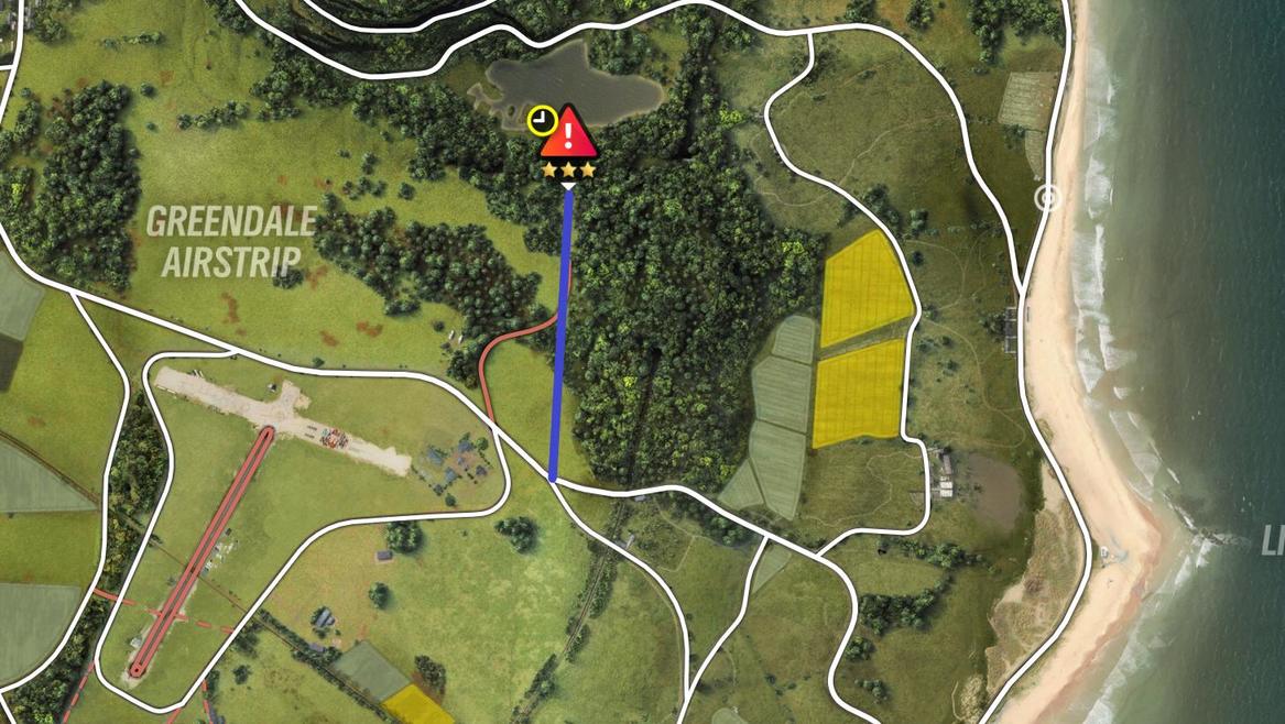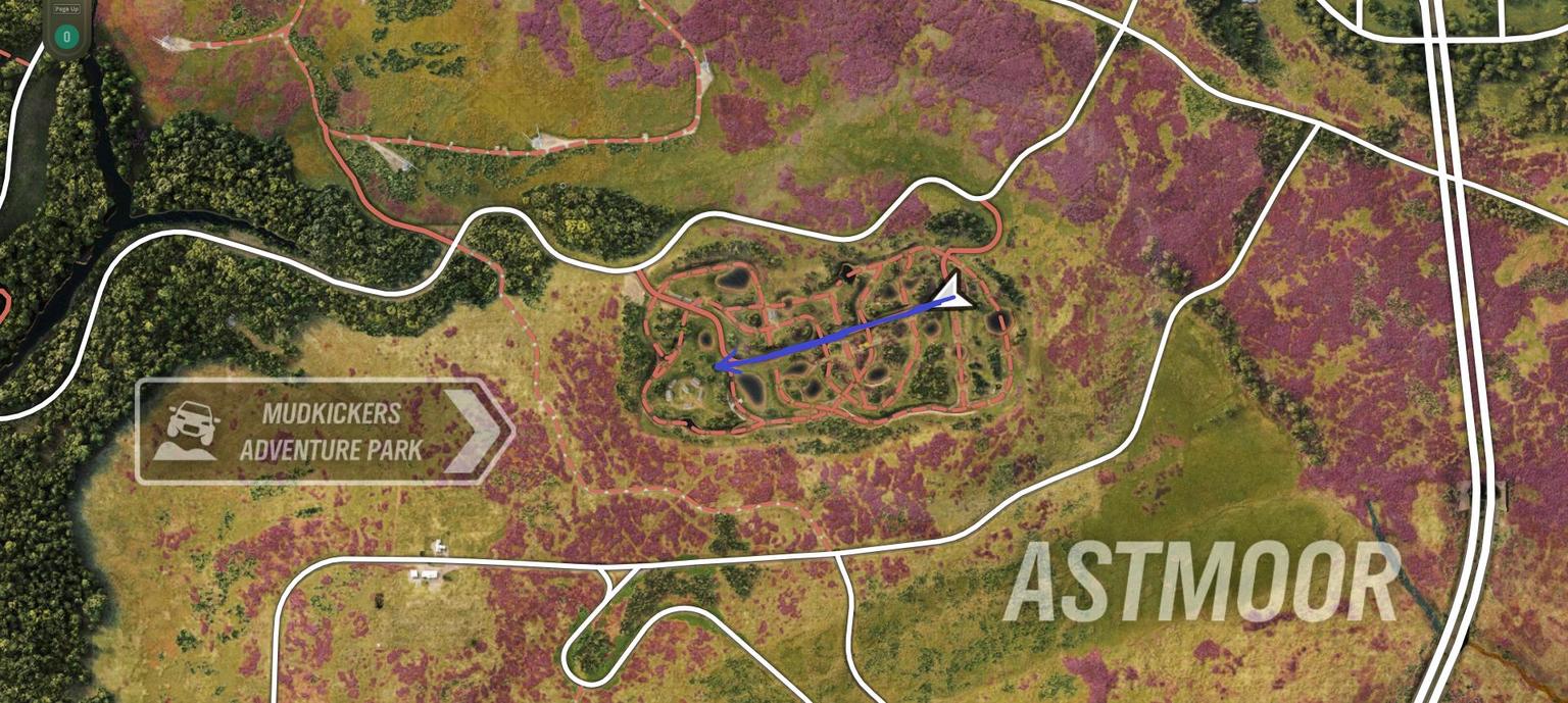 在公园的中间部分有一条泥路(图中已用蓝线标出)。从右往左开可以出现6-7次飞车技术,一个来回就完成任务了