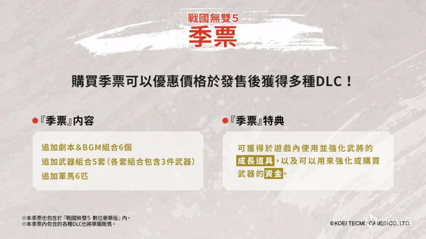 此外季票还将提供特典内容:可获得于游戏内使用并强化武将的成长道具,以及可以用来强化或购买武器的资金。