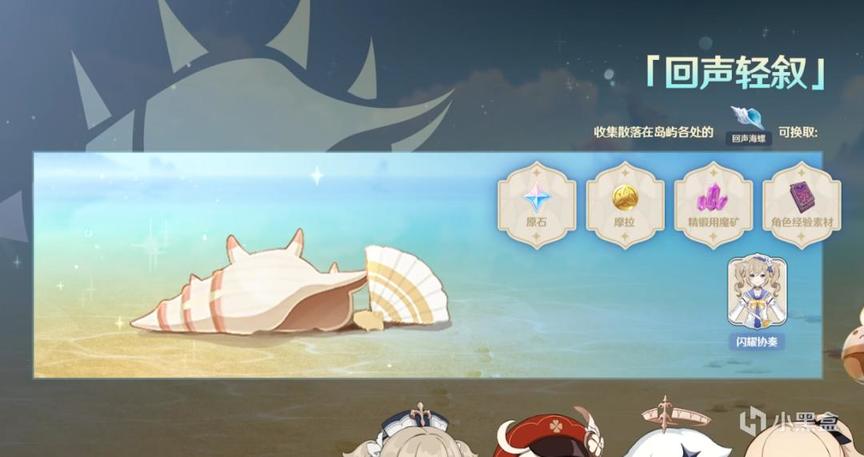 回声轻述,任务随着时间逐步解锁,玩家需要收集散落在海岛地区的「回声海螺」,每个小任务点需要收集不同数量的海螺,每完成一个小阶段玩家都可以听到一段隐藏在海螺里的小故事,算是小惊喜吧。总收集数达到一定数量后获得芭芭拉皮肤——闪耀协奏。