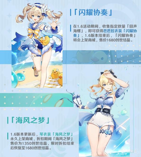 皮肤系统首次开启。芭芭拉——闪耀协奏,可通过限时活动「回声轻叙」收集「回声海螺」兑换。琴——海风之梦,永久上架商城,初始价格1680创世结晶,限时折扣为1350创世结晶。