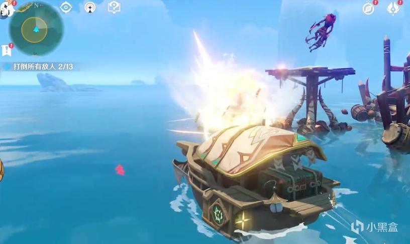 战船!主炮?开火啦!玩家需要驾驶新载具「浪船」清理海面的丘丘人营地,玩家可以选择使用船支火炮开火、也可脱离载具直接深入敌内,登塔作战。部分营地被神秘的护盾包围,需要拾取特定的道具解开,小心,海面并非风平浪静,躲开旋涡。