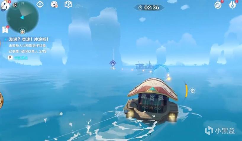 漩涡?竞速!冲浪啦!冲浪竞速赛,该比赛分为海上航道与空中航道两部分。竞速过程中需要留意收集金黄色的「波浪纹章」,途中还有冲刺环,请把控船头不要乱窜喔。拾取的波浪纹章与耗时将决定最终分数。