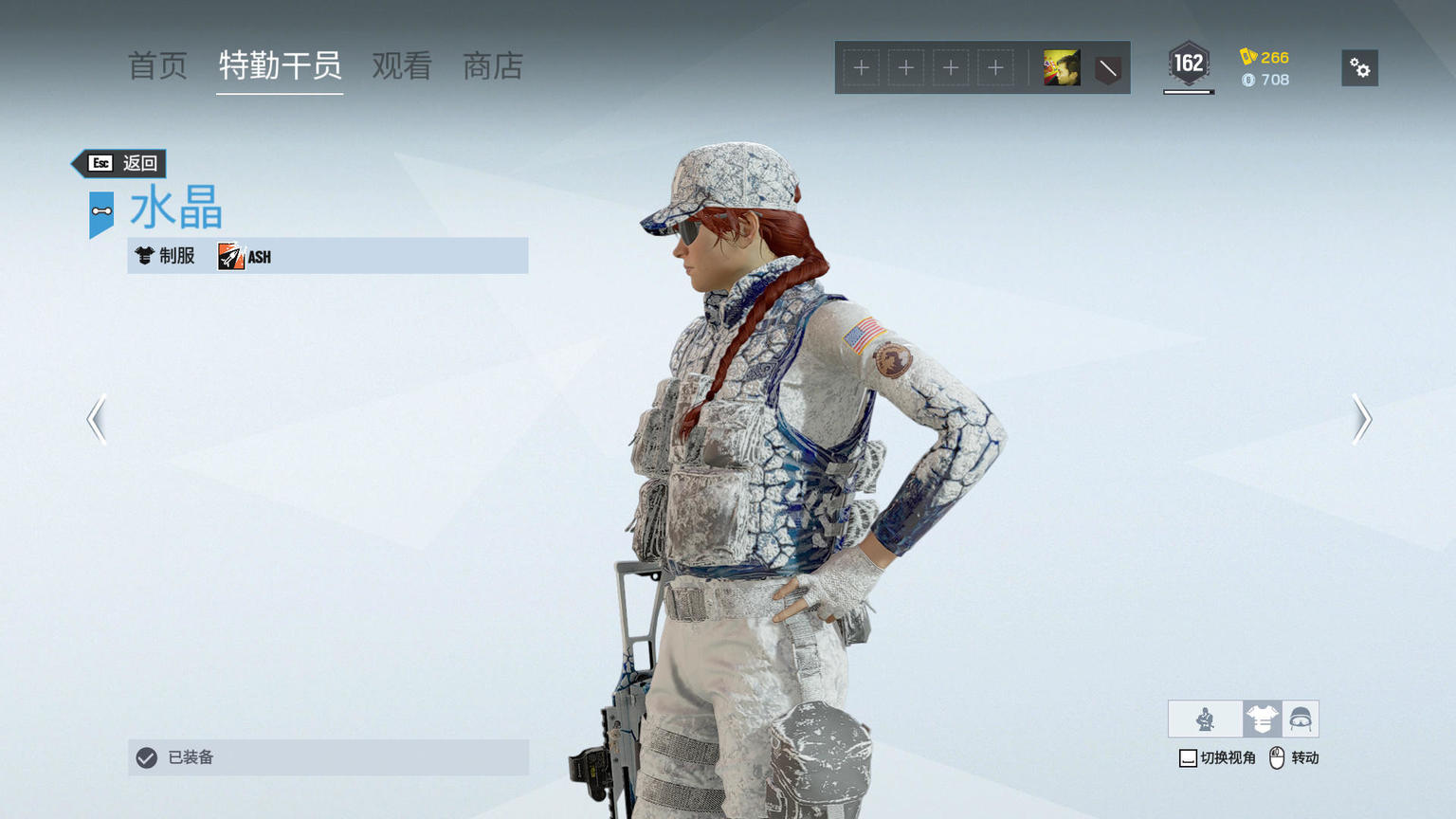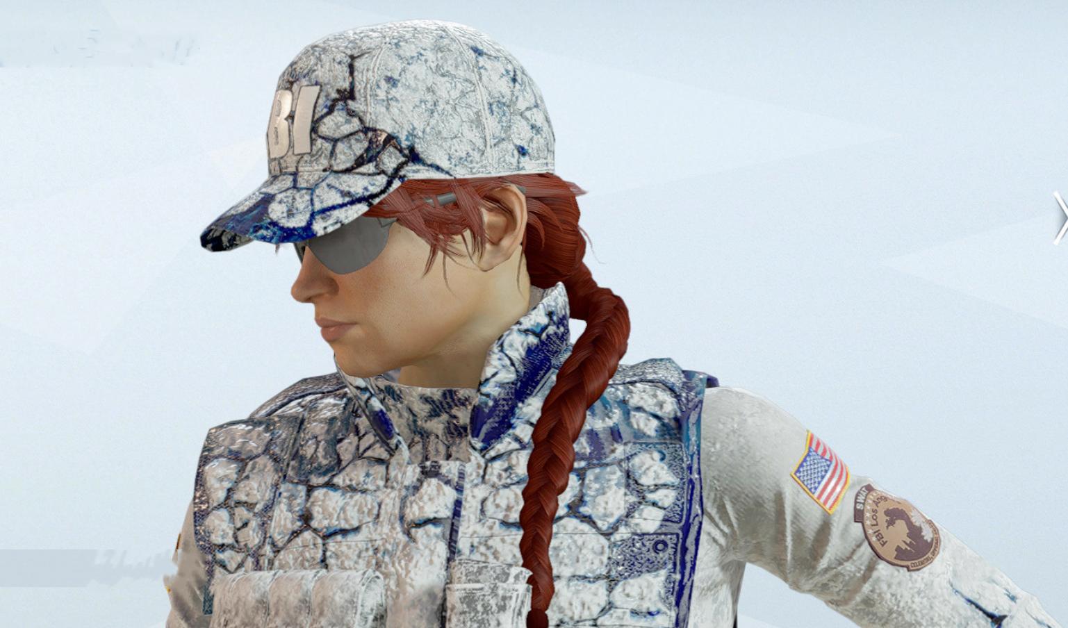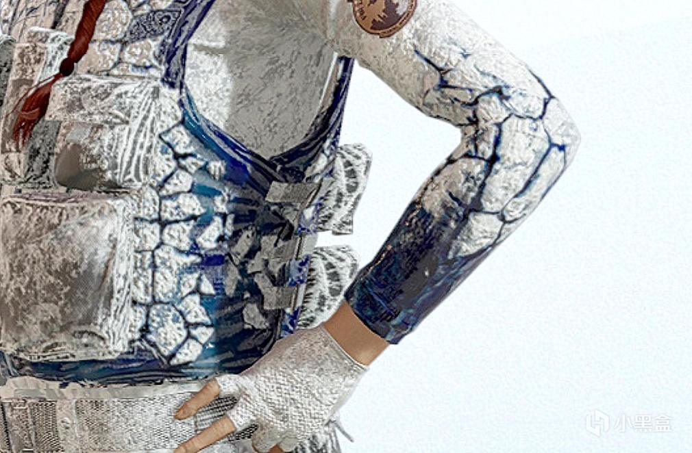 制服上门的防弹衣上,能看到更多蓝白交织的设计,特别是两侧区域蓝色面积更多。Ash前臂的结晶过渡效果明显。