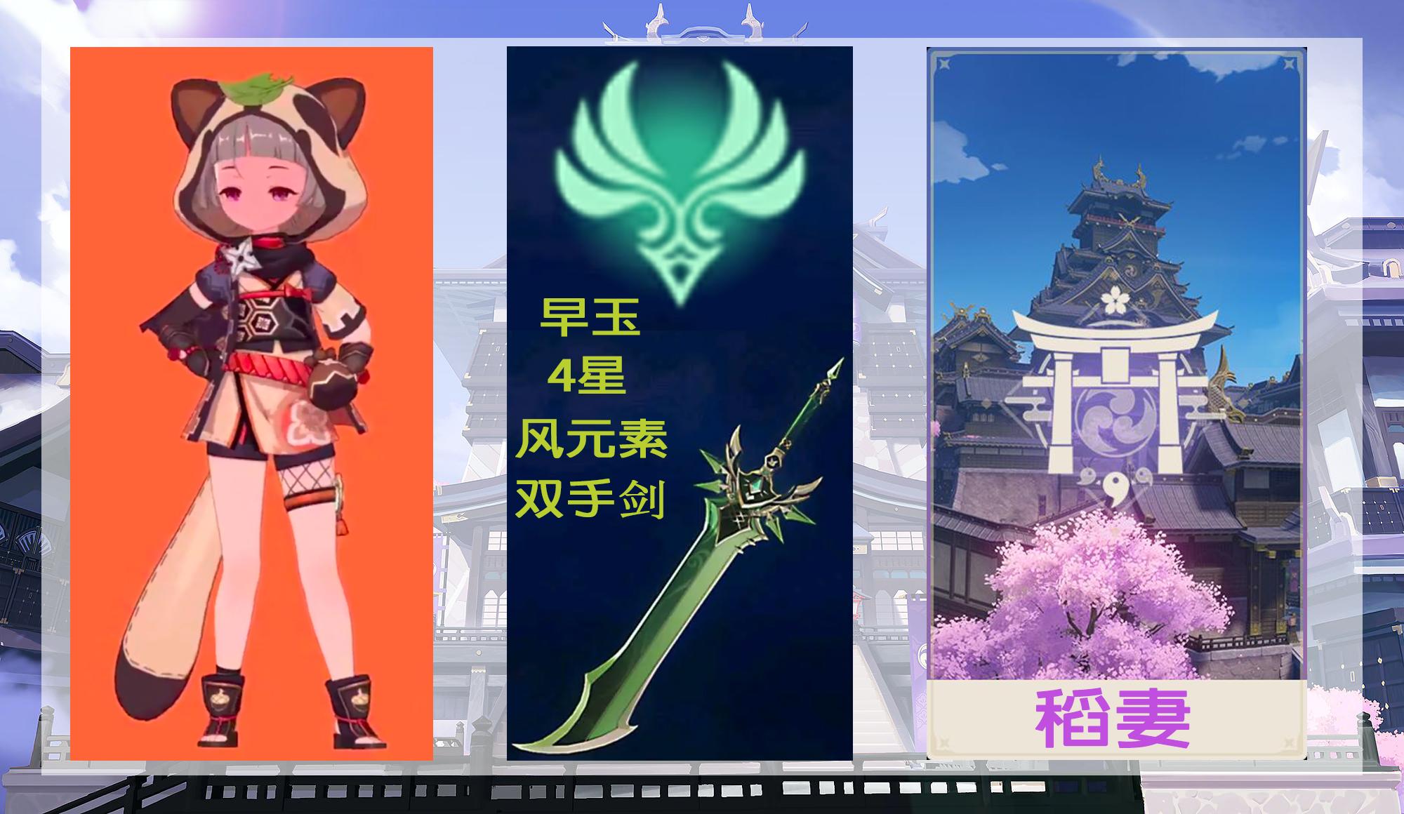 早玉(sayu),稻妻四星风元素双手剑角色,萝莉型体。由于身型问题,双手剑会被适当滴缩小(例如钟离和胡桃使用同一把武器,长度不同)。目前还未见过耍大剑的萝莉角色,不清楚具体的普攻施展方式,人随剑走?