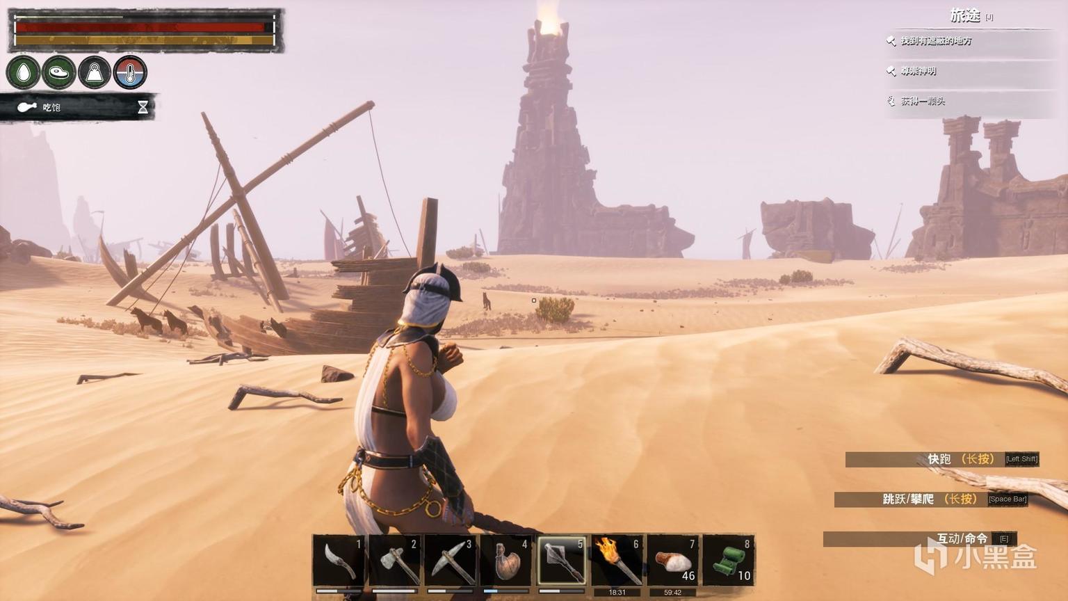 原因很简单,《流放者柯南》几乎可以算是如今市场上分量最足,用料最猛的沙盒或者说是生存冒险游戏。从初上手时,它就不遗余力地向你炫耀起其粗犷的“肌肉”或说是野心:无论是初访流放之地的漫天黄沙,还是搁浅于“西普塔岛”时屹立于远处的高塔,都极显游戏粗犷的视觉呈现,并激起玩家对于未知世界的探索欲望。