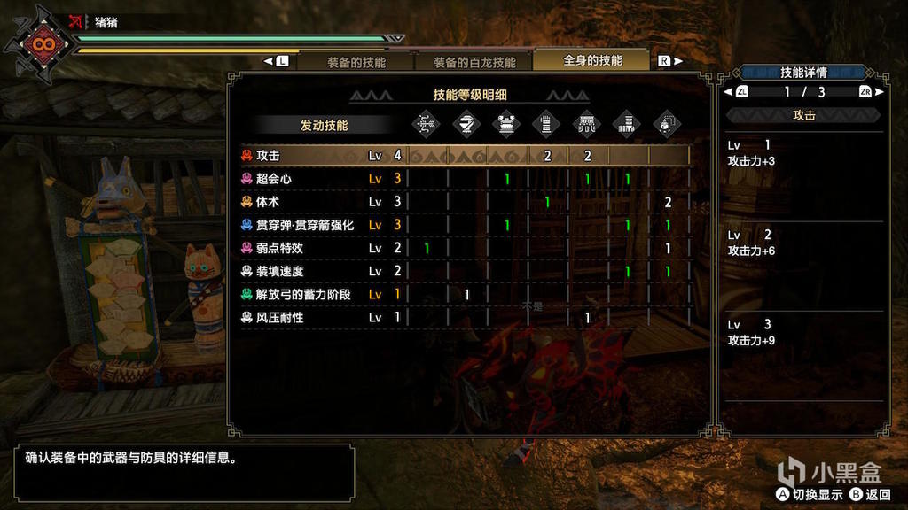 目前连射弓几乎绑定了蛮颚腰,因为它提供的二级技能和一级技能都是弓箭非常缺的,因此没有孔位出其他技能了。在不用蛮颚腰的情况下,优先出超会心。如果能出到超会心2或者3,余下孔位出看破的收益是大于出(不到4级的)攻击的。但是连射以及贯通都不能这样出,扩散弓后面再具体讨论。