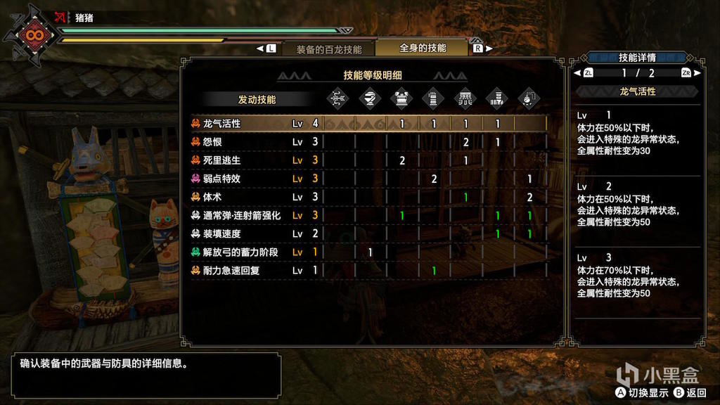 其次是龙气弓。下面是物理弓,由于护石的原因只能出到体术3耐回1,非常不理想。龙弓换武器并把一级孔插上破龙珠即可。物理龙气在属性吸收15的部分情况以及属性吸收10的大部分情况下才强于正常的属性连射;龙属性龙气打火龙一家强于正常配装。