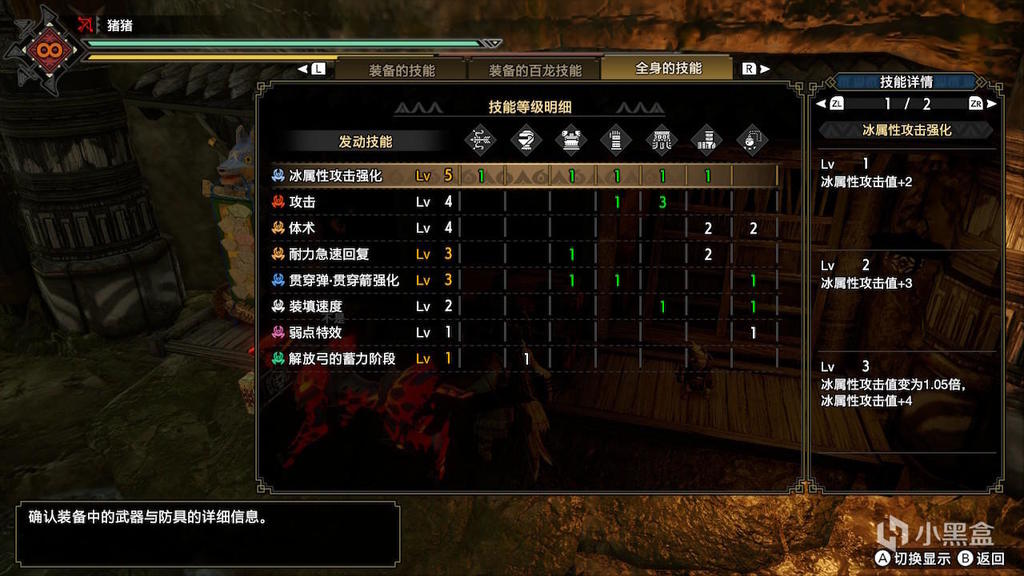 本作弓箭仍然主打属性。技能方面,耐力技能仍然是弓箭首先需要考虑的技能。本作体术可以和强走药叠加,因此体术4+耐回2是最基本的需求。面对打桩机会多的怪甚至需要考虑放弃输出技能出耐回3。强弓是弓箭的第一输出技能,必出。弹种强化3提升物理伤害20%,也是必出的技能。装填速度2可以使瓶子自动装填,在输出条件好的时候打强击瓶,输出机会不好的时候打接击瓶,可以变相提高输出,推荐出。以上技能属于必出技能,以连射弓为例,几乎所有配装都会优先考虑这些技能。一级孔再插完装填速度2之后,剩下的一级孔插属性强化珠子,一般来说属性强化至少应该能出到3。