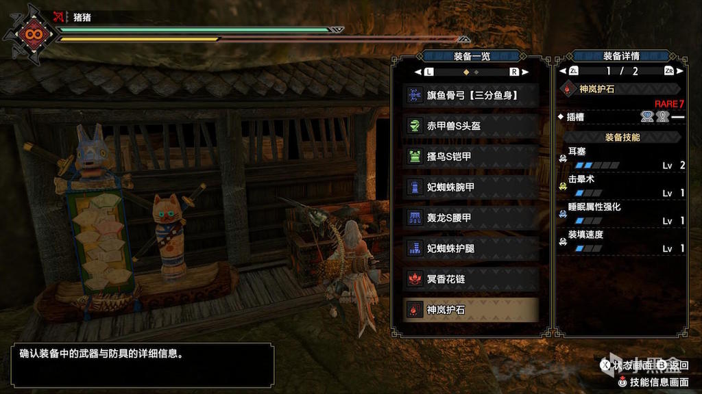 本作由于装填速度的存在,打控制更加流畅了。武器使用旗鱼衍生,拥有强化过的麻瓶以及眠瓶,以及扩散3的5只箭,配合异常强化可以3箭打出机关蛙的异常。搭配刚射绝和击晕术,弓箭拥有了三个控制手段。下面的技能中耳塞可以换更多的耐力技能,也可以下一些耐力技能出节弹打更多的瓶子。根据解包数据,3蓄和4蓄的异常补正一样,所以不用出强弓。护石很随意,技能不够下耐回体术即可。