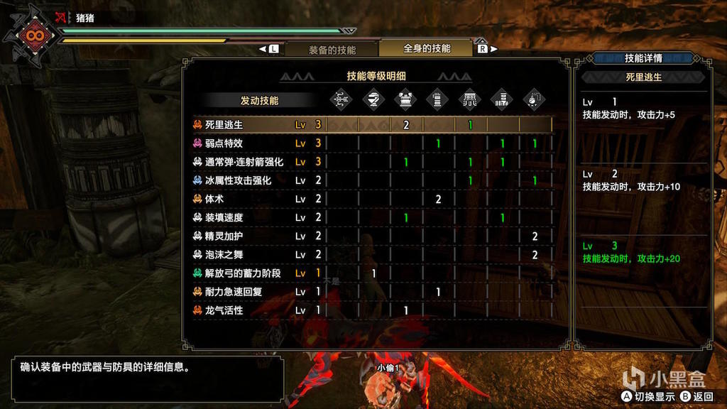 3.0带来的最大提升就是死里逃生。可以主动触发死里逃生的技能有天彗龙套装的龙气,泡沫之舞以及鬼火缠身。鬼火缠身需要出到4,且触发需要怪物发怒,不稳定,因此不考虑了。泡沫之舞3级能带来2级体术以及2级回避性能,触发条件为进行3次翻滚或回避,持续30秒,被打失效。对于弓箭,进行连续的滑平刚循环也是可以触发的。泡沫之舞的触发条件与效果都比较契合弓箭,可以考虑。龙气触发会失去除了龙属性以外的其他属性和异常效果,适合龙属性以及物理弓。