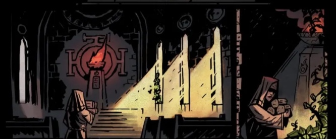 殿堂的大门缓缓打开,随之而来的怒斥之声唤回了犹尼娅飘忽的思绪,圣火的熄灭使得黑暗爬满了殿堂与她的内心。窗外的画卷依旧美丽而诱人,但犹尼娅已无心沉溺在其中,等待着她的将是严厉的斥责与惩罚,“罪”将被烙印上这颗虔诚但已被欲望侵染的内心。