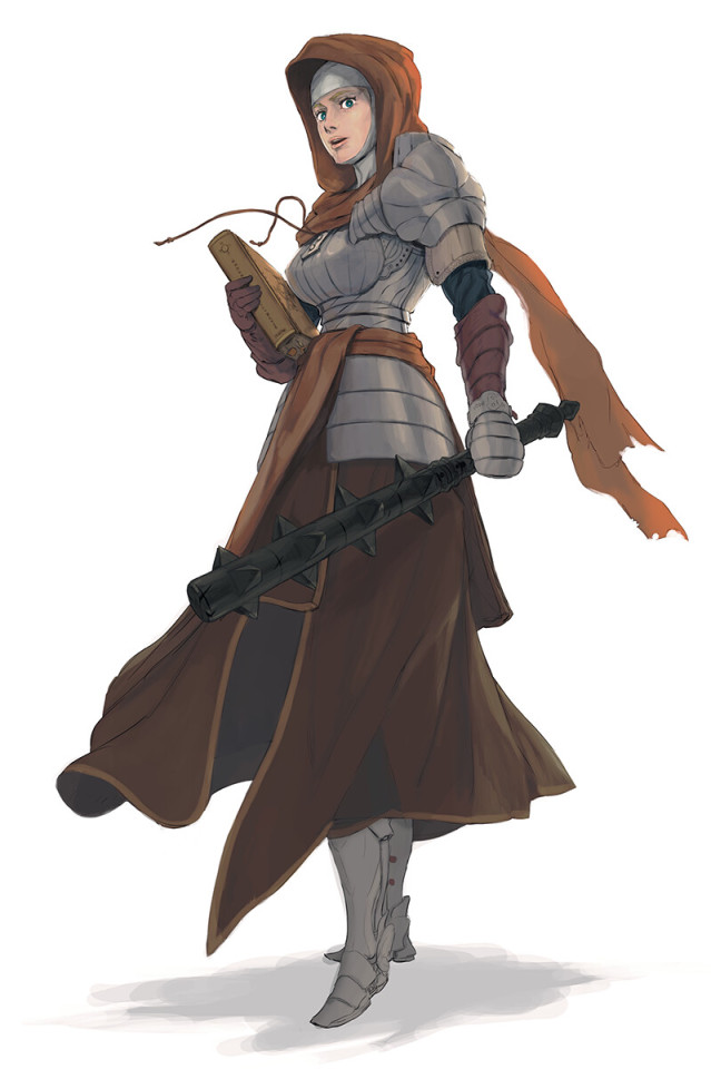 在大多数人的印象里,修女应是虔诚且圣洁的,但犹尼娅仅能与治愈联系在一起。红勾的立绘将犹尼娅表现得略显粗壮,其战斗的职能则在肩甲与铁锤上得以体现,怀中的圣经同时承担着治愈与启示的功能。肩负着审判与治愈的虔诚信徒走向了与圣洁格格不入的黑暗,是为了将信仰传播、驱散邪祟还是出于某种惩戒与放逐?