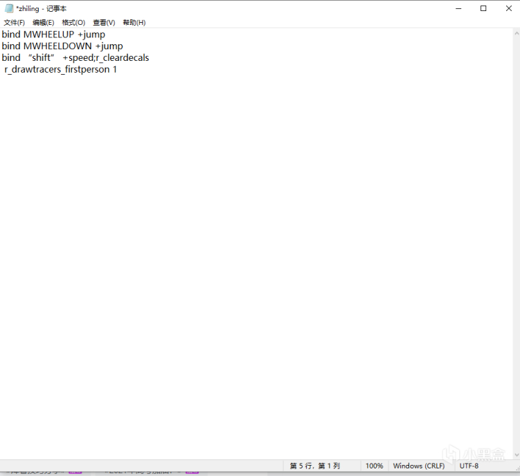 然后点保存,把后缀改为.cfg。 进入游戏后在控制台输入 exec空格cfg文件的名字即可。例如: exec zhiling