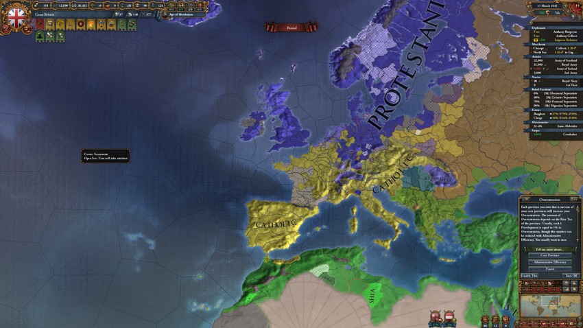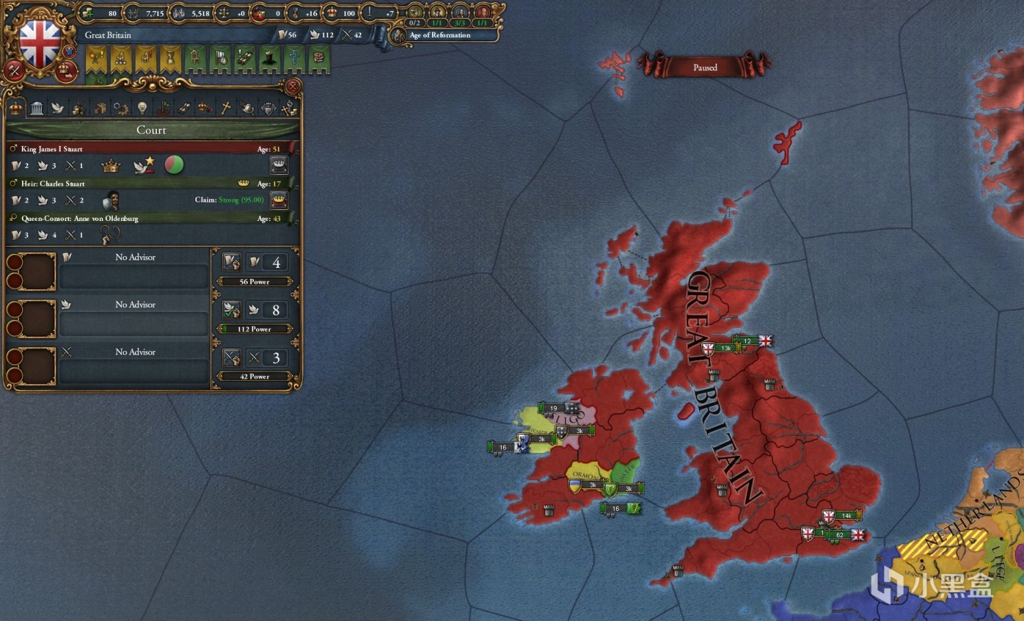 回到游戏,吞并了爱尔兰的大不列颠一边站队新教同盟,一边在北美和西班牙比拼殖民的速度,毕竟此时的不列颠的核心利益已经是殖民地带来的巨大的贸易额,而不是欧洲大陆一两块芝麻大的土地。因此,为了争抢西班牙的殖民地,以及防止哈布斯堡王朝在欧洲一家独大,站队新教同盟是必然的选择。