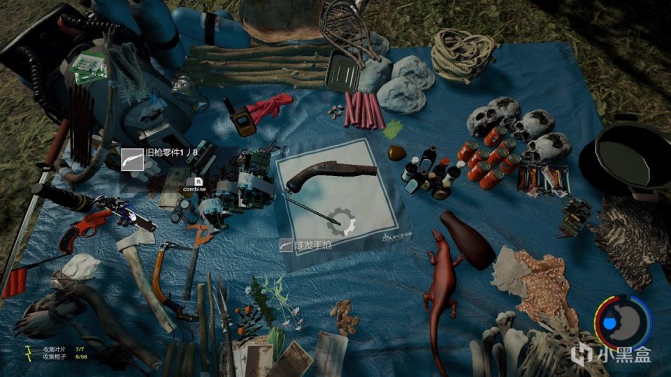 而当我们获取了新的资源后,就可以开始发挥自己的奇思妙想了,游戏的合成界面是一张野营毯,而玩家背包中的道具则分布在毯子四周,当我们将材料放上去之后,材料下方就会出现一个不完整的齿轮,当我们添加的其他材料可以与之组合的时候,齿轮就会变得完整,这就代表我们可以用这两样东西合成新的道具了。