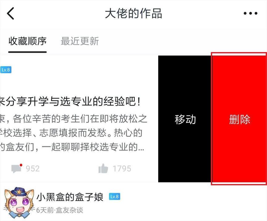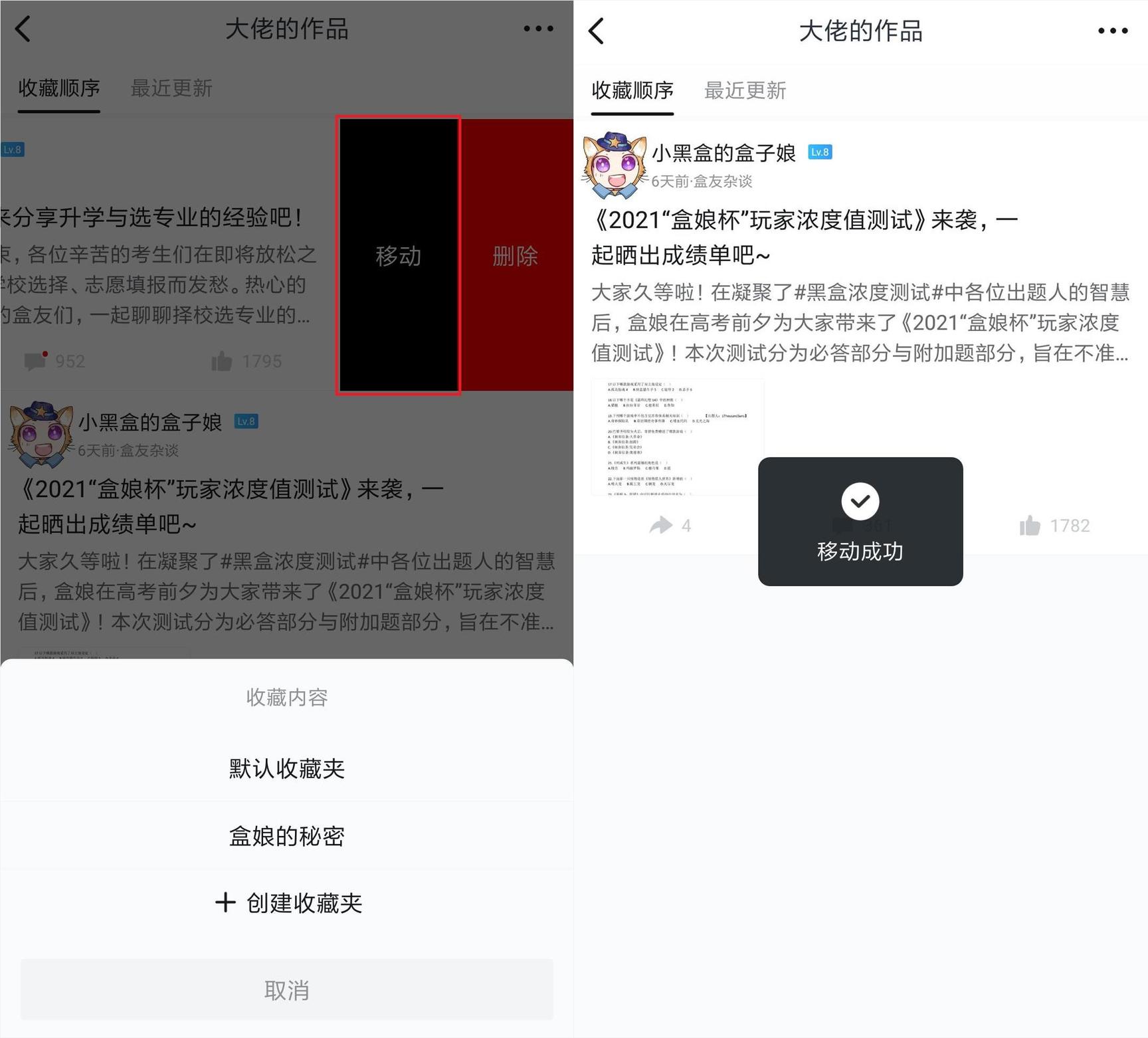 细心的hxd们已经注意到上图中左滑帖子出现的“移动”按钮,点击它即可将该帖子移动到其他收藏夹。