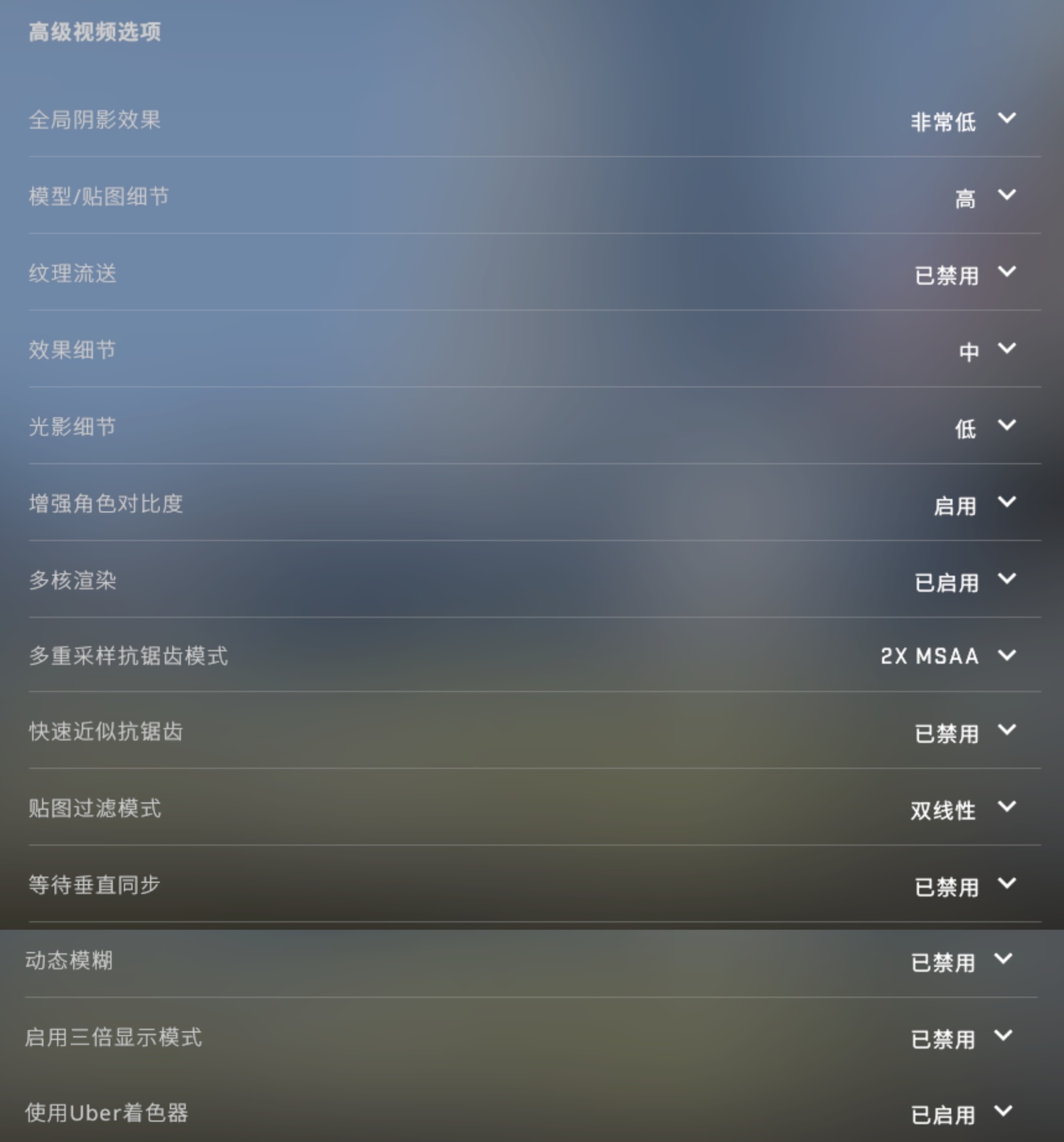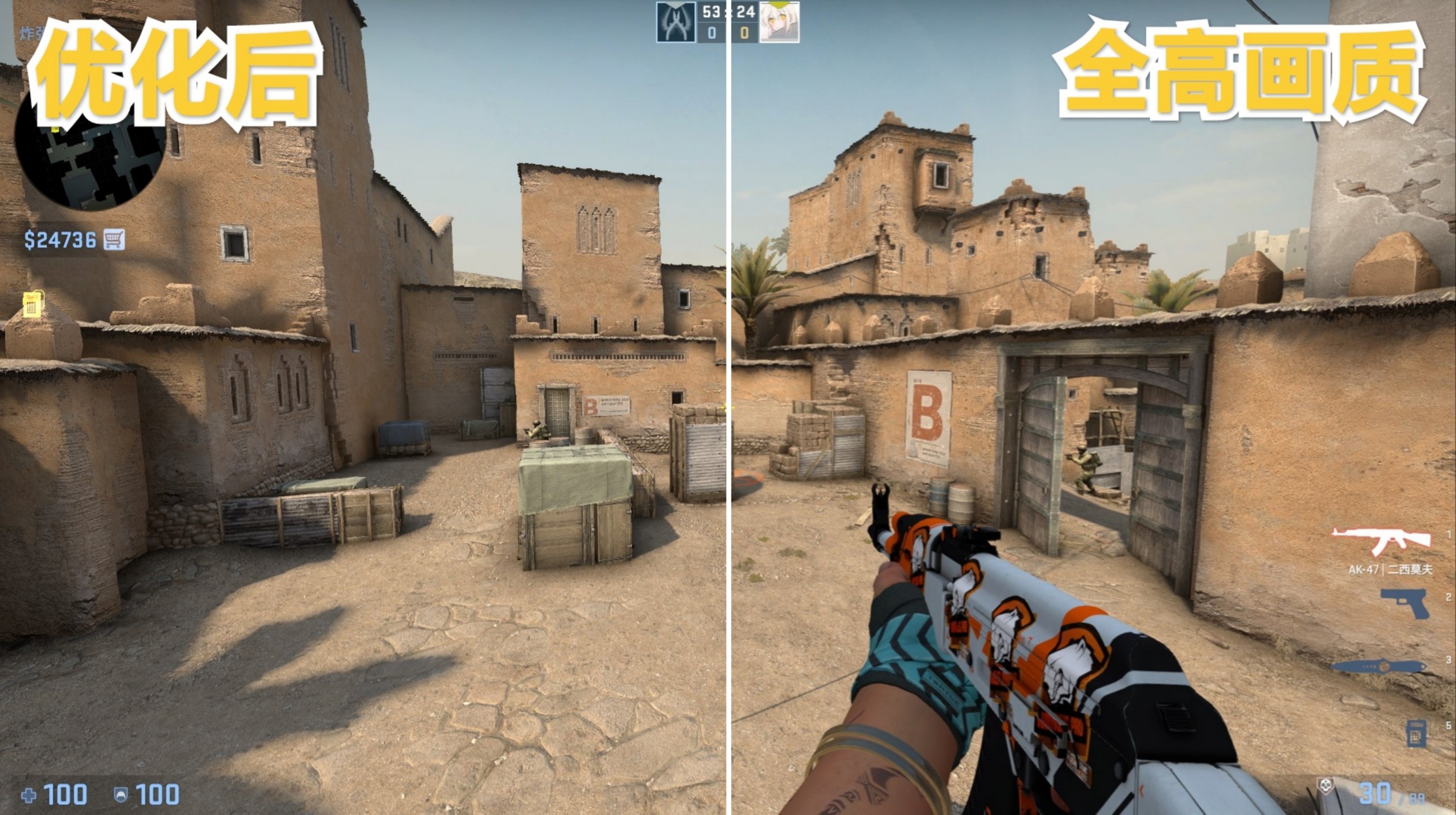 不过CSGO的最低画质和最高画质其实并无太大不同,没有简陋到看不下去的地步。而我们要调试的,正是一些画面提升不大但对性能影响较大的选项,以此来提升自己的帧数。
