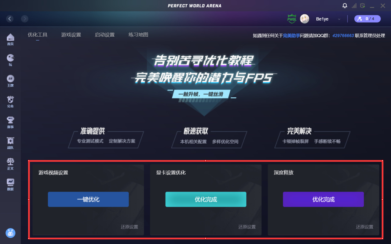 方法一:打开完美平台,点击一键优化。