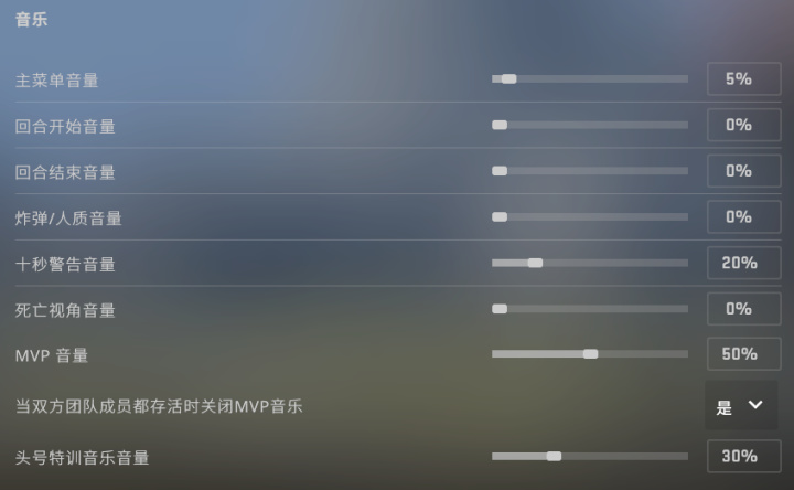 再然后就是音乐盒音量调整。我建议只留炸弹十秒倒计时音乐和MVP音量,关闭双方存活时播放MVP凯歌。这样可以防止音乐遮盖声音和让人分心。