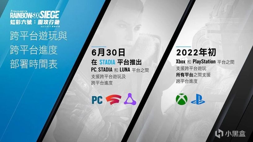 在图片左侧部分,就是6月30日STADIA推出的PC,STADIA和LUNA三个平台之间的跨平台游戏和跨平台进度就是关于云游戏。目前看来,由于STADIA和(Amazon)LUNA两个云游戏平台推出时间远远不及彩六,更多的是让PC端上的彩六玩家能够通过云游戏平台继承原本的育碧账号,在不需要下载彩六的情况下,随时随地进行游玩。