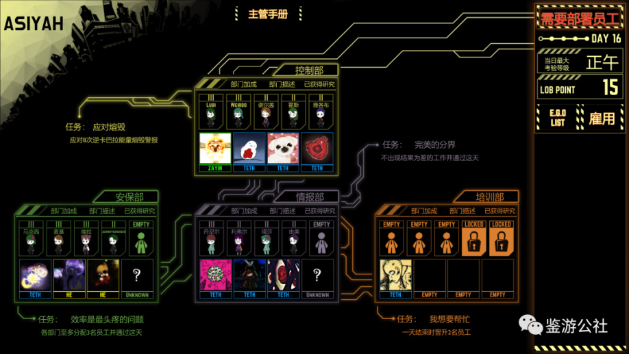 除此之外,人工智能“Angela”以及各个部门的“Sephirah”会在每天的工作结束后与我们进行对话,除了推进剧情外也会给予我们一些操作上面的提示,而我们身为主管,必须竭尽全力使员工们远离异想体带来的威胁,同时保证能源生产效率维持在最优水平。