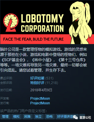 《脑叶公司》是由Project Moon制作并发行的一款管理“异想体”的模拟游戏,2018年4月9日在steam发行,游戏原价80元,史低价32元,好评率为93%,史低价格购买具有较佳的性价比。