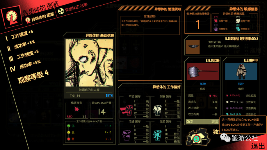 而对于异想体的详细信息,在对其工作前将毫无思绪,能做的只能是派遣员工进行尝试,并通过独立的PE-BOX储量解锁异想体的观察等级,了解其基础信息、管理须知、工作偏好和敏感信息,对其进行适当地管理工作。