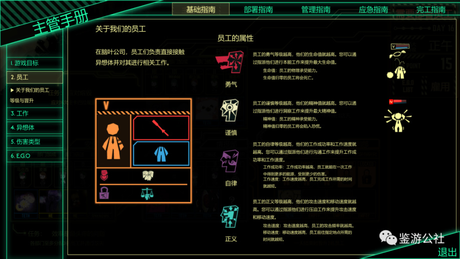 在脑叶公司,员工需要接触异想体并对其进行相关工作,员工有着4个属性,分别为勇气、谨慎、自律和正义,对应着异想体的4种不同的工作,即本能、洞察、沟通和压迫,员工的每项属性都有着5个等级,从事相对应的工作将能够提升对应的属性,员工属性综合值超过一定数值便能得到晋升,从而能去从事更加危险的工作。