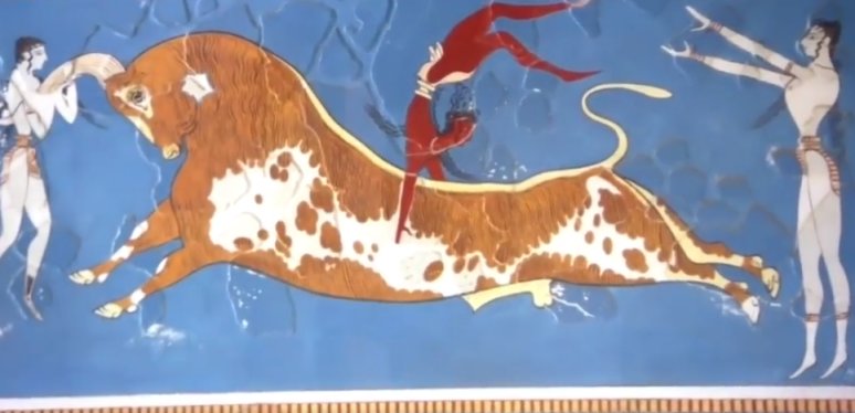 根据部分壁画艺术祭品等,我们可以发现米诺斯文明存在公牛崇拜,他们有公牛祭祀,有跳牛运动,所以牛头怪物很可能就是一个头戴牛面具的祭司(牛战士不会摘下他的面具)。前面曾说到,米诺斯命令建造一座巨大的迷宫以此来困住他的牛头怪物儿子,按照现实解释,这些个迷宫很有可能是一片巨大的宫殿群,也有一种说法是这些宫殿是岛上进行祭祀活动的洞穴,在部分岛上的洞穴里挖出了大大小小数百把青铜斧器,据说还有人类的残骸,这说明米诺斯文明可能还有人类祭祀的习惯。这样想那个牛头怪物的神话的话,就很好解释了: