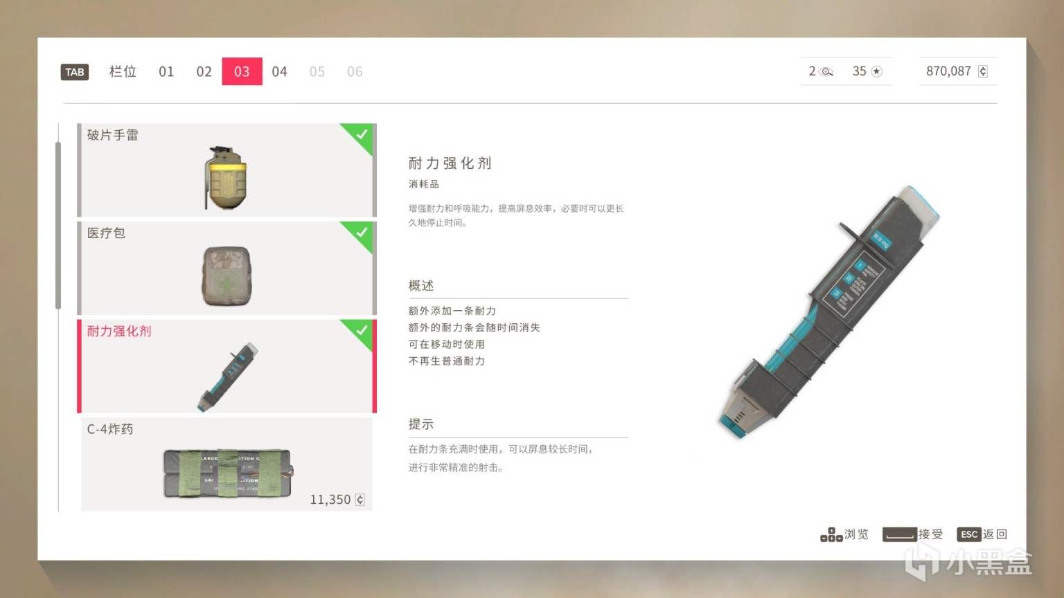使用耐力强化剂之后屏息时间会延长,按住shift屏息之后需要在屏息时间内击杀5名敌人