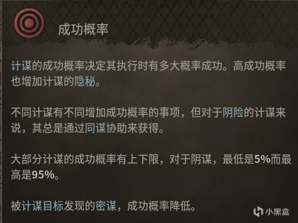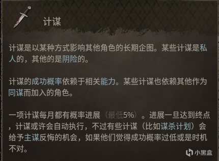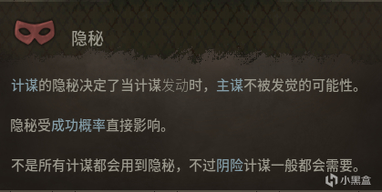 所有的阴谋都包括两个重要指标——成功率与隐秘度。私人计谋则只有成功概率。如果取消针对某人的某个阴谋计划,那么在一定的时间内不能再对该角色进行相同的阴谋计划(所以慎重选择目标和计划)。另外,在获得阴谋家这个特质后,就能同时执行2个阴谋计划了。