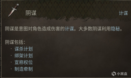 阴谋包括谋杀,绑架,宣称权位,制造牵制(除谋杀外,其余需要生活方式的技能支持)。