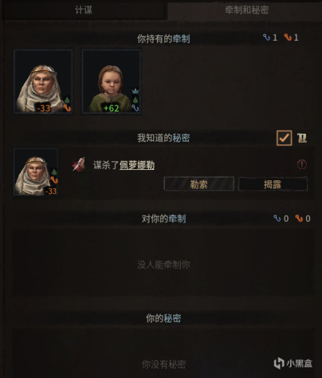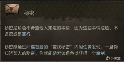 你可以通过间谍总管来发现秘密或是某些事件得知一些秘密。秘密可以被用来勒索目标,根据秘密的严重程度获得不同等级的牵制(比如谋杀罪行就是强牵制),或者你也可以揭露这个秘密给大众,从而获得监禁角色的理由。