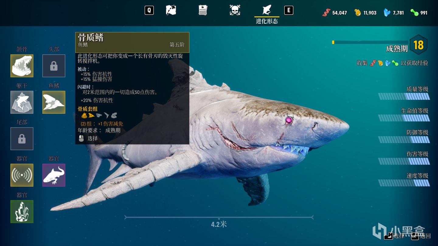 再来就是战斗部分以及进化系统,首先鲨鱼能够通过捕食获得经验以及各类升级道具(诸如矿物、脂肪等等一系列),完成任务也能够获得经验。这些东西能够帮助鲨鱼完成从幼年体向成熟体乃至究极体的进化(外形以及体型上的变化,数码宝贝既视感)。进化能够让鲨鱼打破先前撞不开的井盖进入一些之前无法进入的区域以及前往下一个区域。不仅如此,在击杀吞食猎物后鲨鱼还能够获得DNA,积攒一定数量之后能够升级替换身体零部件甚至能够变更搭载性能更为强劲的器官来进一步提升自身的属性(我懂了,这分明是机械鲨鱼)。