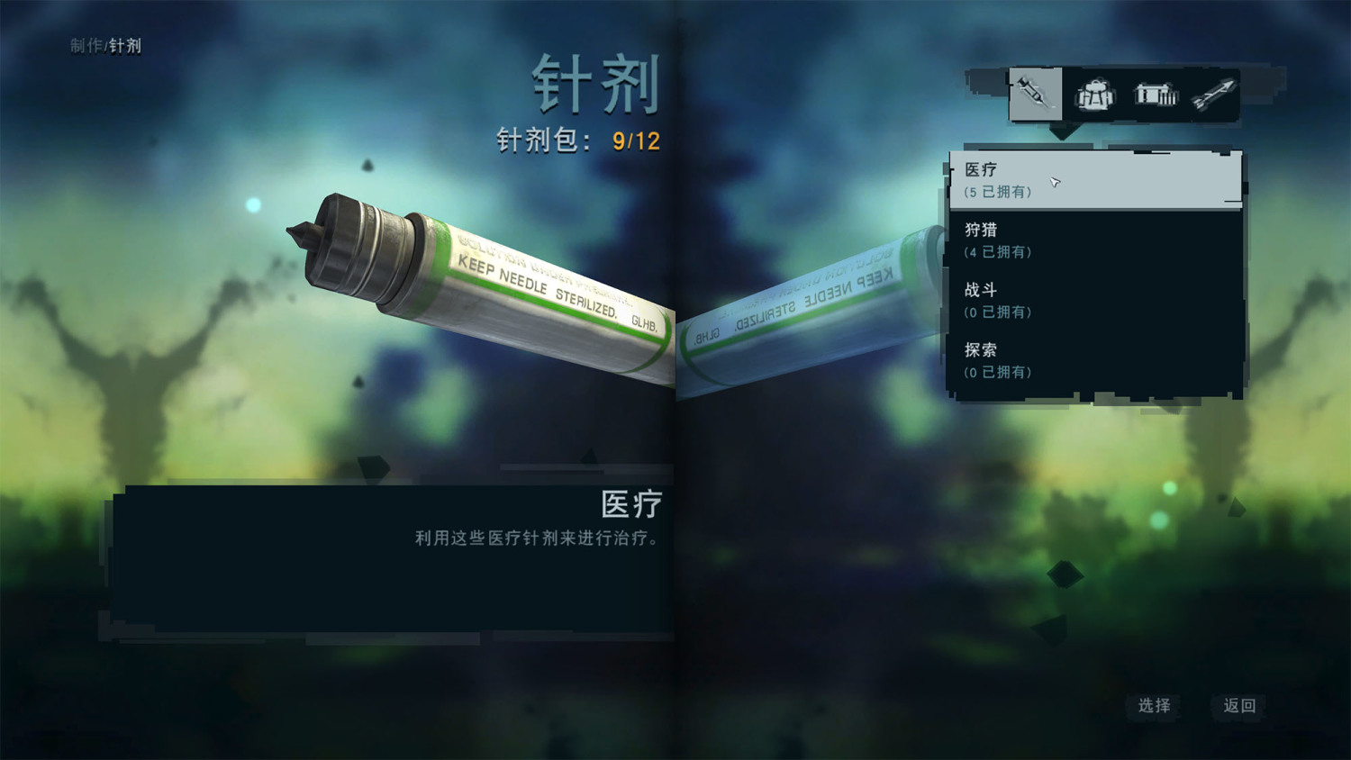 采集就是收集叶子做针剂,常用的就是猎人本能(标记动物)和回血了,其他都很少用。