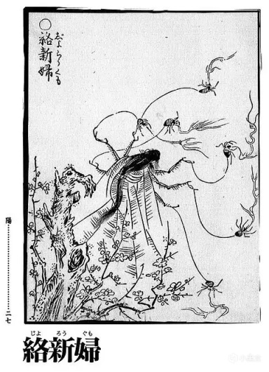 络新妇在日本也算是比较有名的妖怪了,虽然比不上酒吞天狗之流,传说是一个美女在嫁给大名后耐不住婚后生活的寂寞,于是红杏出了墙,结果被绿帽子大名现场抓包,就被丢进装满了毒蜘蛛的箱子被活活咬死,谁知道她的怨气和蜘蛛同化,就变成了鬼蜘蛛。。
