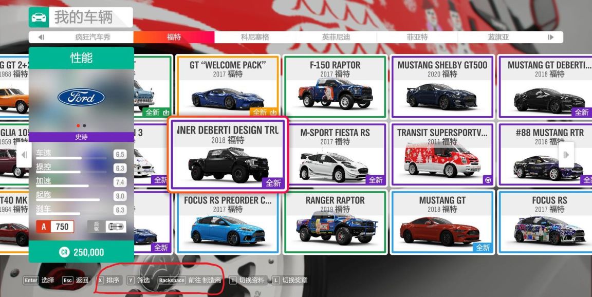 1.在车展或者车库的下方均有这几个选项,其中排序是可以针对年份、等级、类型等进行排序;筛选则是可以只显示某一类别