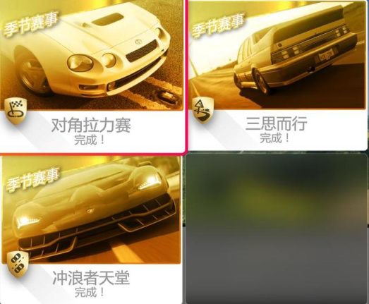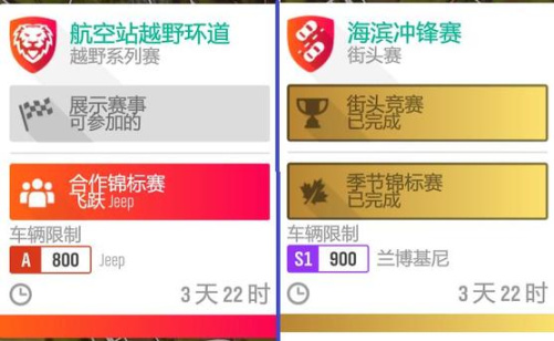 每周会安排三个季节赛事给玩家取得车辆或者服饰、喇叭等,且会有严格的车辆类型、等级限制。