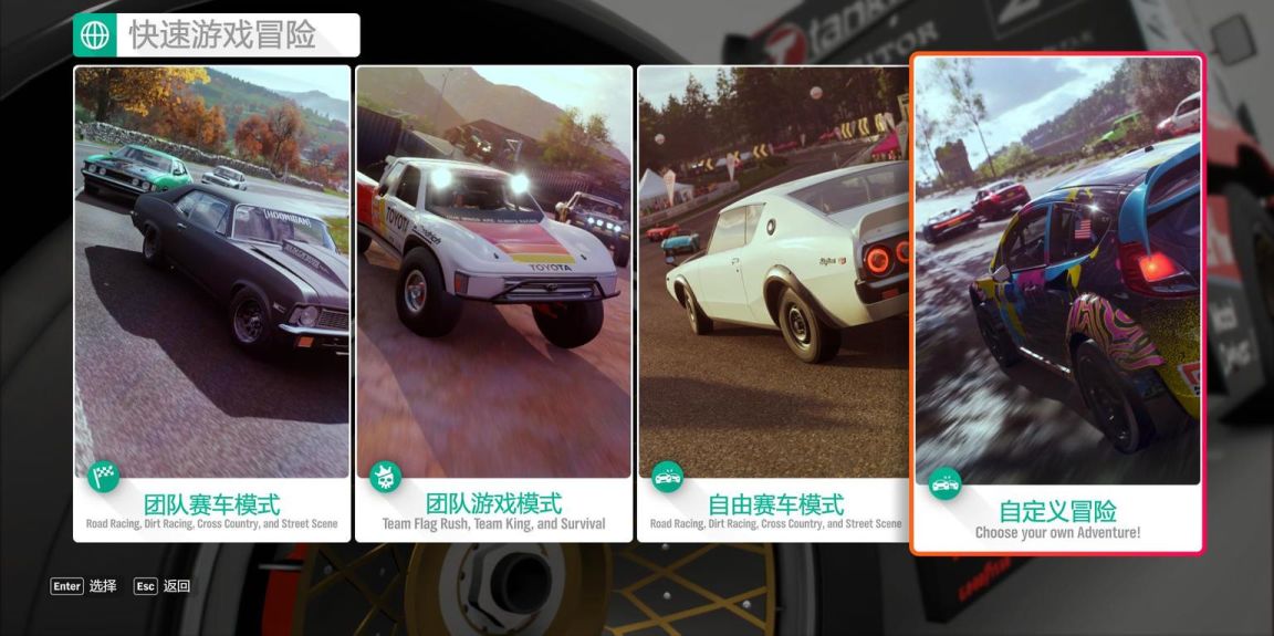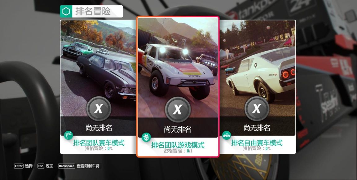 点进去后可以看到四个选项,其中前三个是系统分配比赛。个人建议玩两个赛车模式,游戏模式会非常煎熬