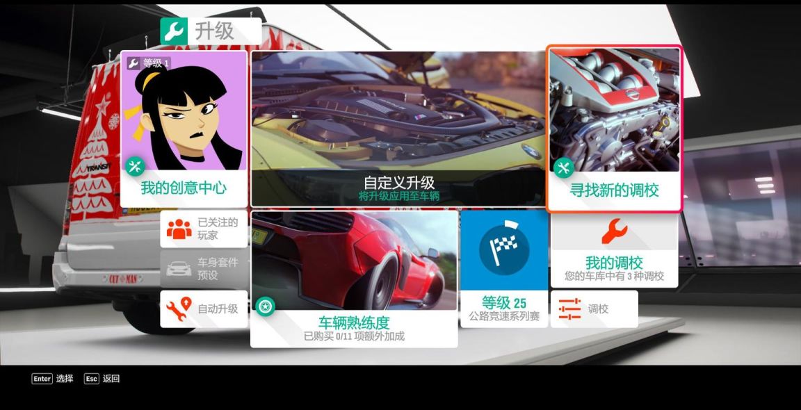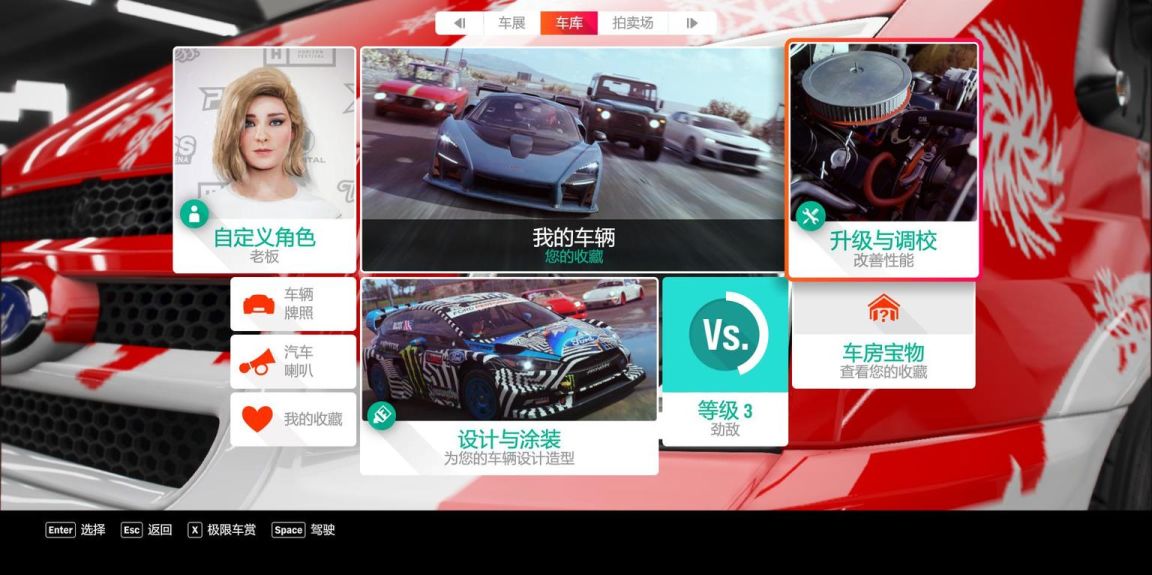 1.首先要驾驶你要改装的汽车,然后在车库页面中选择升级与调校