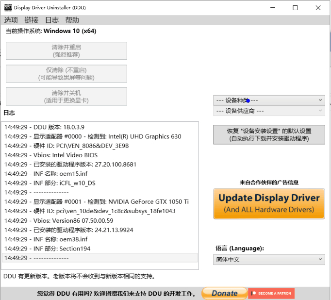 选择显卡NVIDIA,使用强烈推荐的清除并重启,等待卸载完成自动重启就可以安装新的驱动了。