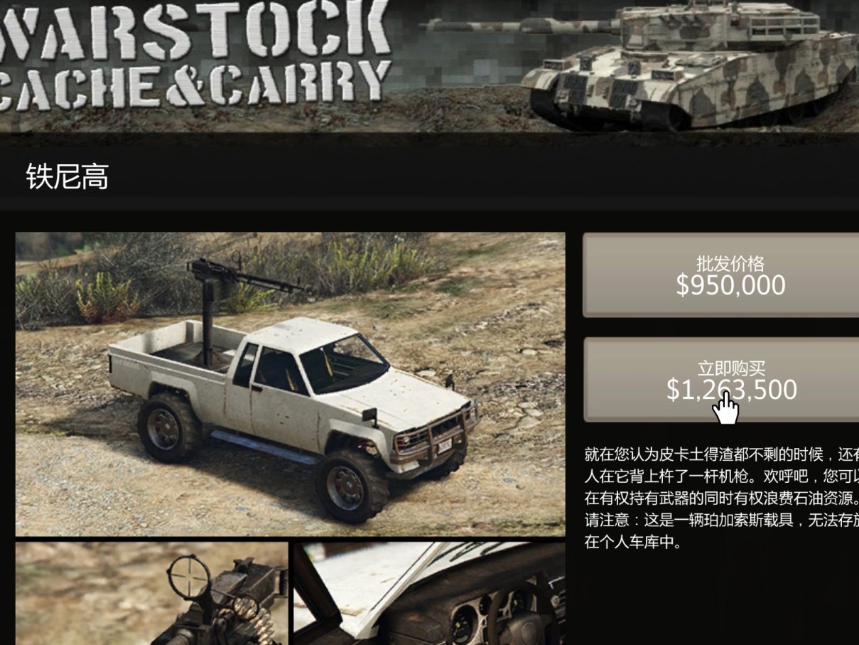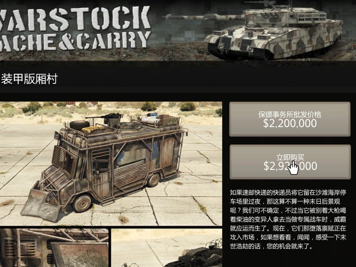 然而售价确实高达2926000,通过特殊载具运送而解锁的批发价也要2200000。要知道,普通厢村的售价是39万。所以这一身的铁皮加上机枪要250多万,除非喜欢末日风,否则购买可以说丝毫没有用处。