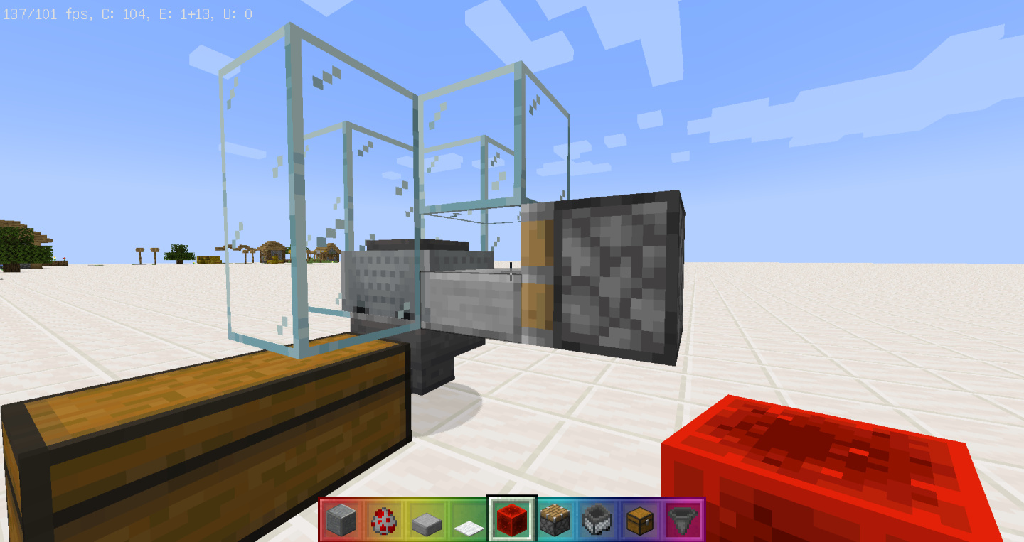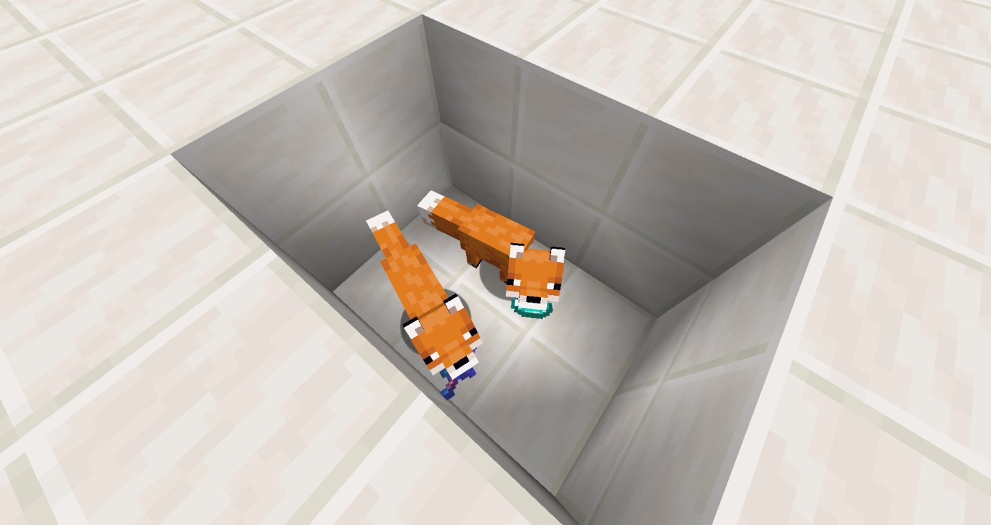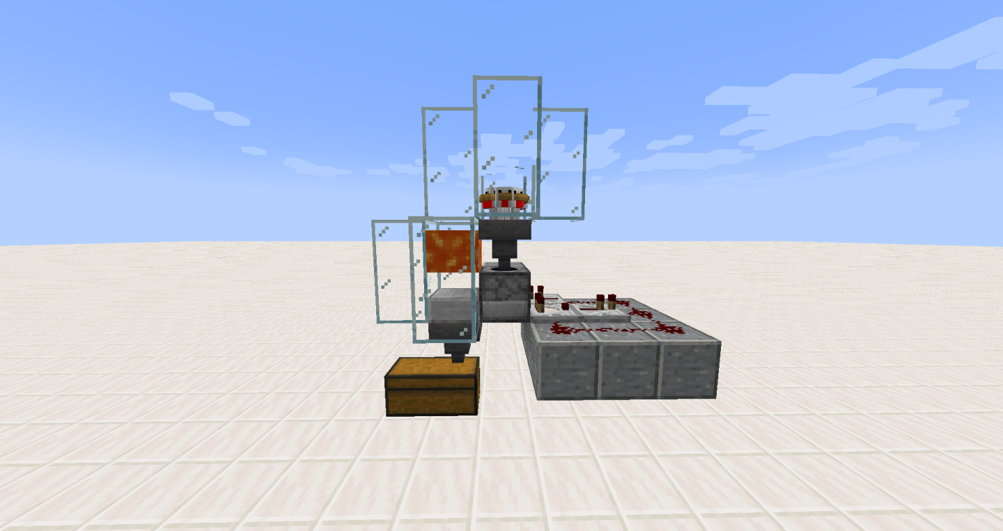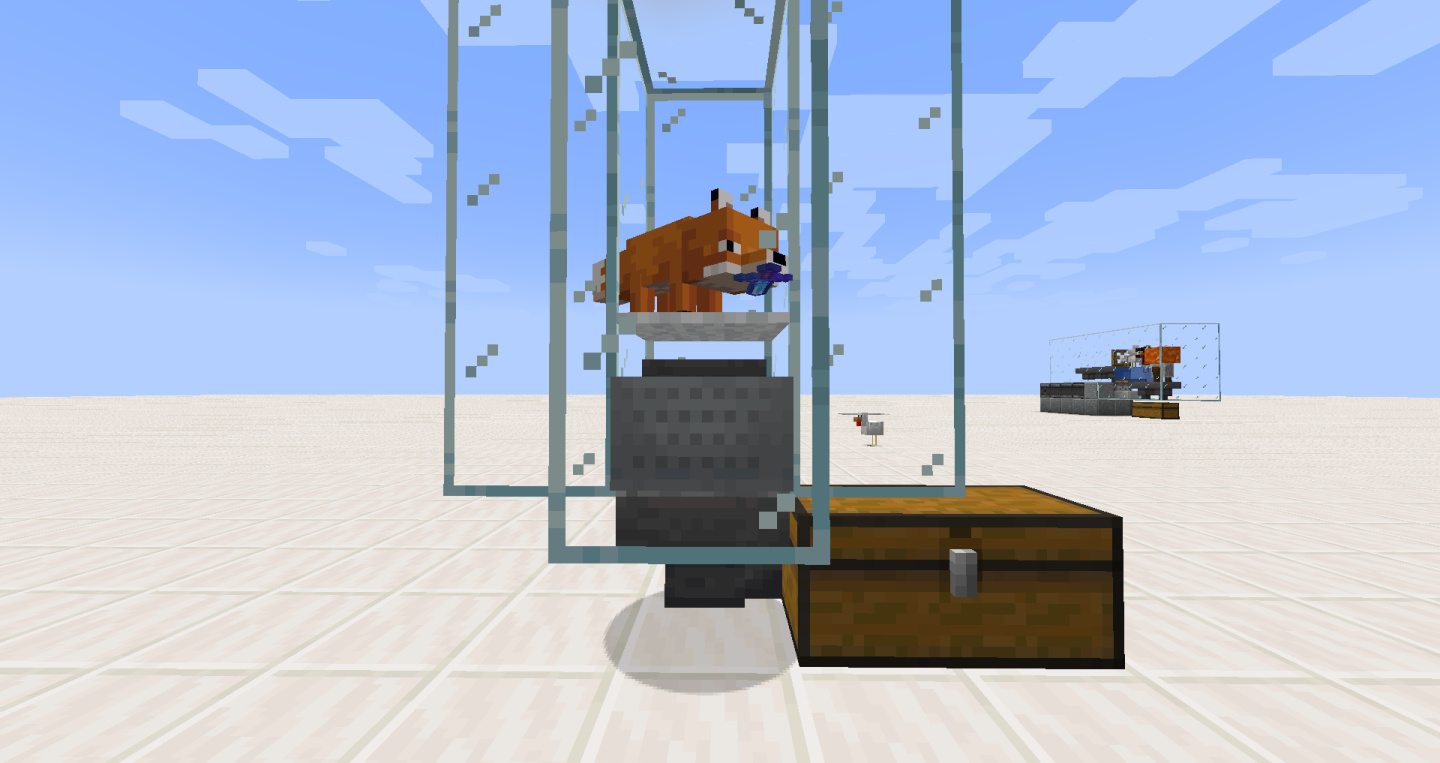 这里的收集装置采用通过活塞推入半砖的漏斗矿车来收集,能达到生物能够站立在上面,并且瞬间收集掉落物而不被狐狸替换掉嘴里的武器。