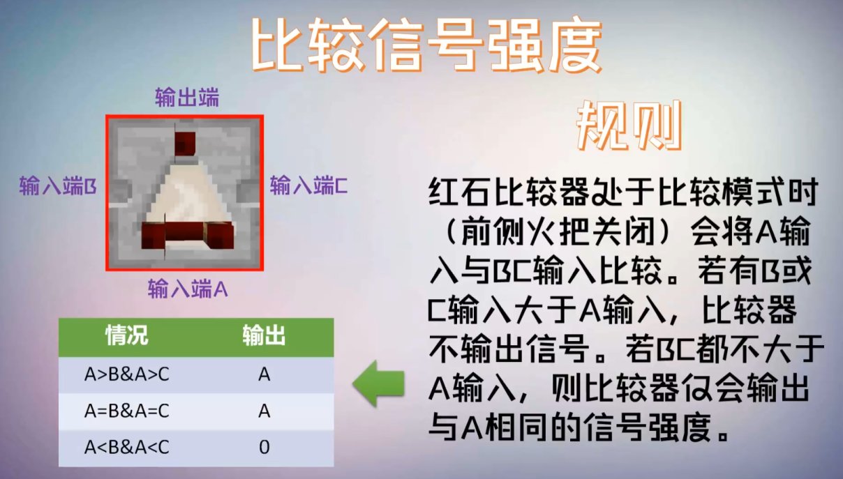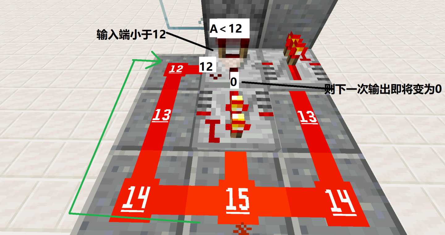 还是这张图↓,在第一个中继器输出端分开两条路输出,另一条(绿色箭头)到达比较器侧面输入端是12信号强度。