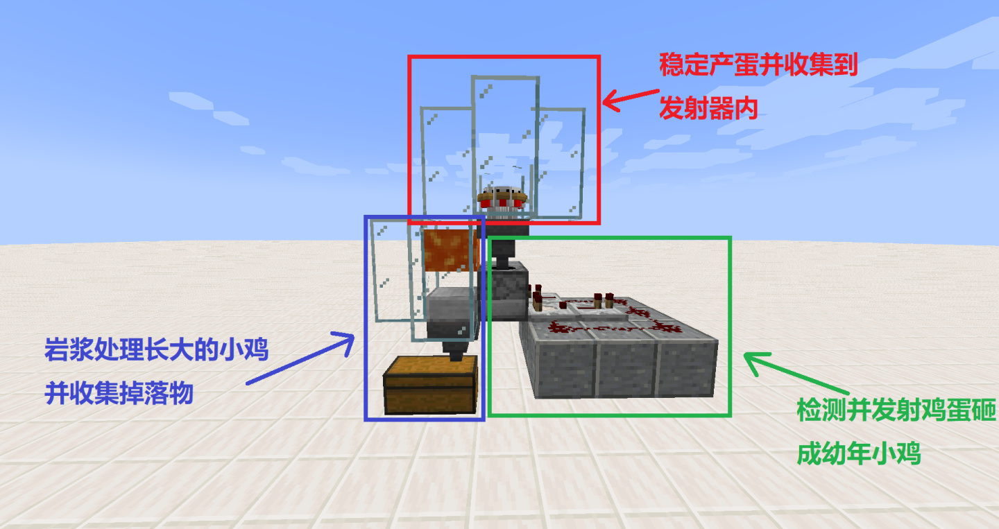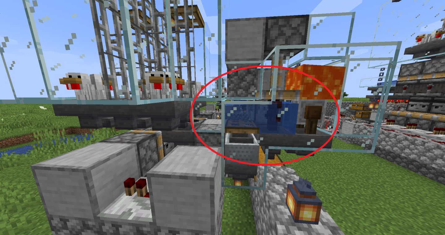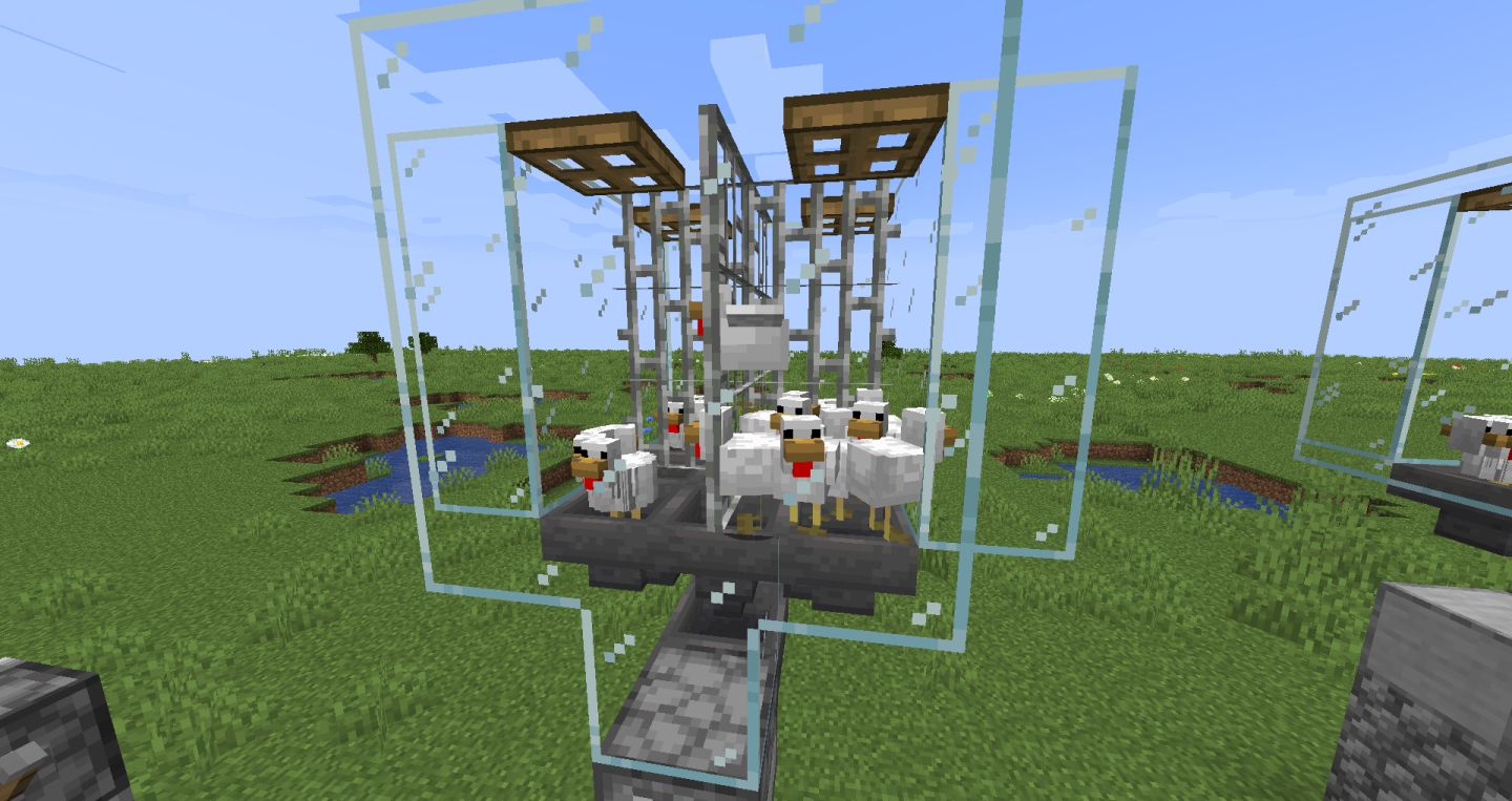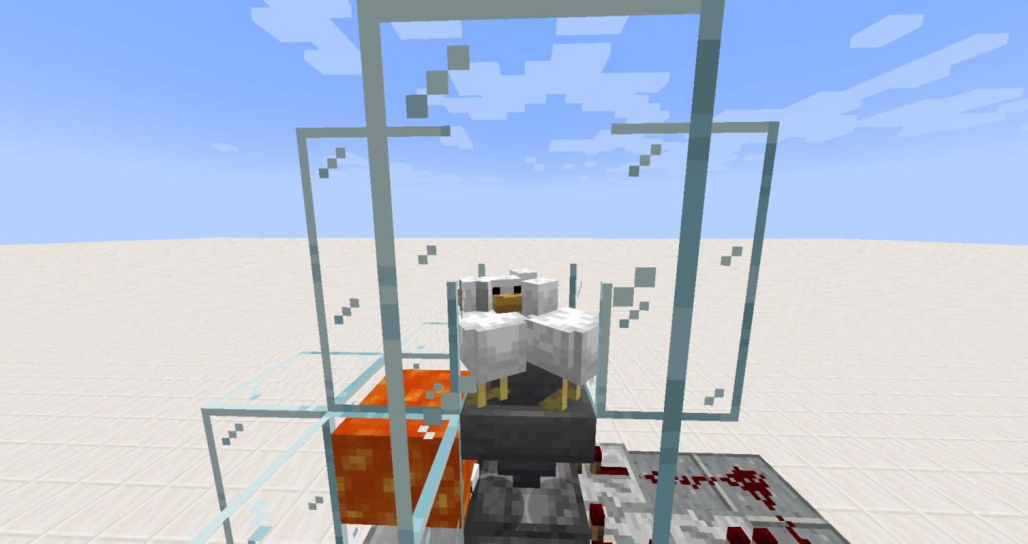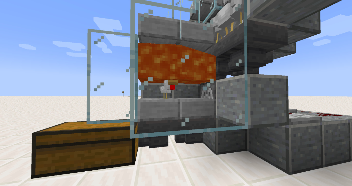 成年鸡会不定时下蛋,蛋收集到发射器内,感应电路检测到会激活发射器发射鸡蛋,在岩浆下方生成小鸡,小鸡长大后接触到上方岩浆,死亡后掉落熟鸡肉和羽毛。